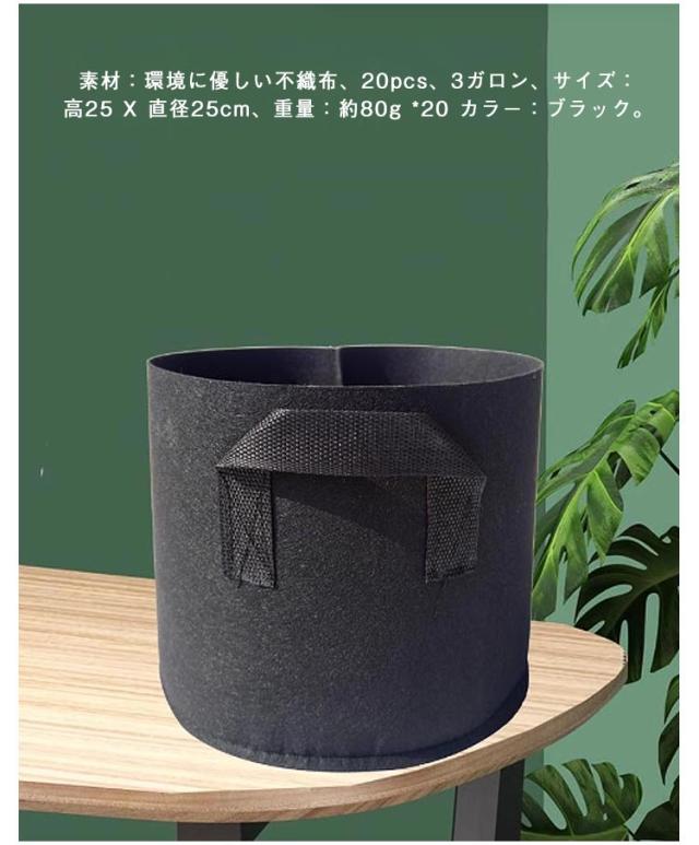 | 3ガロン不織布プランター。【25x25cm】【20個セット】【取っ手付き】 素材:環境に優しい不織布、20pcs、3ガロン、サイズ:高25 X 直径25cm、重量:約80g *20 カラー:ブラック。 高品質の厚手の不織布と裏地から作られ、通気性、浸透性が良い。植物育成に大きな役に立ちます!再利用可能な分解性材料で、簡単に腐食しない。軽量で、空間を占めない、ベランダや庭には使えます。花や果物などの植物を栽培でき、普通の植物栽培鉢よりもっと便利です。無公害、環境に優しい植え袋です。 高品質の不織布を採用し、普通の植物栽培鉢より軽量です。人性化設計に従いました。もっと軽量で持ち手が付いてるので移動が楽です。使用しない時は収納できます。季節や気候に影響されない、全年間でも移植することができます。 厚手で丈夫な素材を使用し、耐磨耗性と耐腐食性が良いです。しっかり縫製してあるため、耐久性がいいです。長期に使えます。使用の後は分解可能です。環境にも優しいです。 不織布プランターで、陶磁器とプラスチックを作られた植物栽培鉢より、通気性と浸透性がもっと高いです。植物成長の空間が大きくて、水と栄養素が自然に浸透させ、植物の根の成長速度をコントロールできます。植物にとって、水分と栄養を吸収しやすいです。植物の生存率を改善できます。 | |