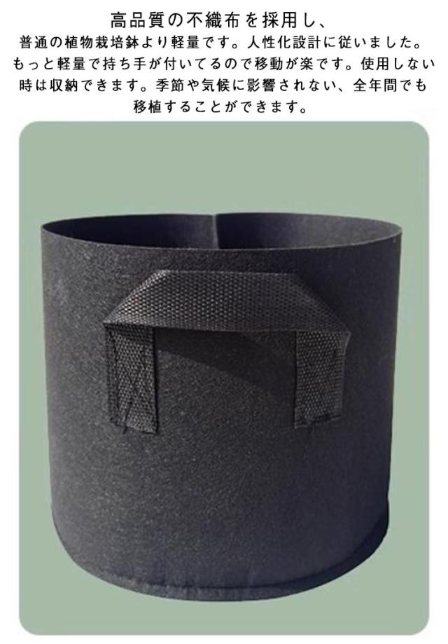 | 5ガロン不織布プランター。【30x25cm】【20個セット】【取っ手付き】 素材:環境に優しい不織布、20pcs、5ガロン、サイズ:高25 X 直径30cm、重量:約110g *20 カラー:ブラック。 高品質の厚手の不織布と裏地から作られ、通気性、浸透性が良い。植物育成に大きな役に立ちます!再利用可能な分解性材料で、簡単に腐食しない。軽量で、空間を占めない、ベランダや庭には使えます。花や果物などの植物を栽培でき、普通の植物栽培鉢よりもっと便利です。無公害、環境に優しい植え袋です。 高品質の不織布を採用し、普通の植物栽培鉢より軽量です。人性化設計に従いました。もっと軽量で持ち手が付いてるので移動が楽です。使用しない時は収納できます。季節や気候に影響されない、全年間でも移植することができます。 厚手で丈夫な素材を使用し、耐磨耗性と耐腐食性が良いです。しっかり縫製してあるため、耐久性がいいです。長期に使えます。使用の後は分解可能です。環境にも優しいです。 不織布プランターで、陶磁器とプラスチックを作られた植物栽培鉢より、通気性と浸透性がもっと高いです。植物成長の空間が大きくて、水と栄養素が自然に浸透させ、植物の根の成長速度をコントロールできます。植物にとって、水分と栄養を吸収しやすいです。植物の生存率を改善できます。 | |