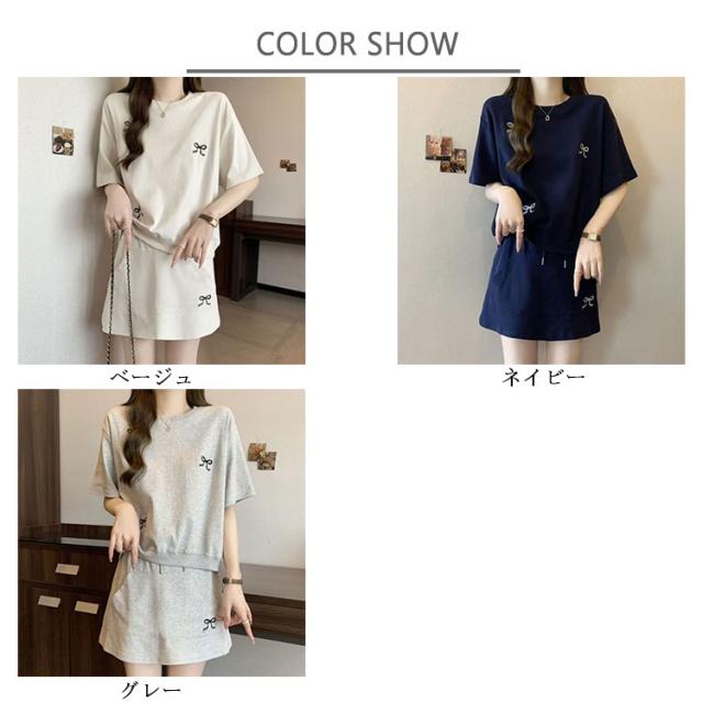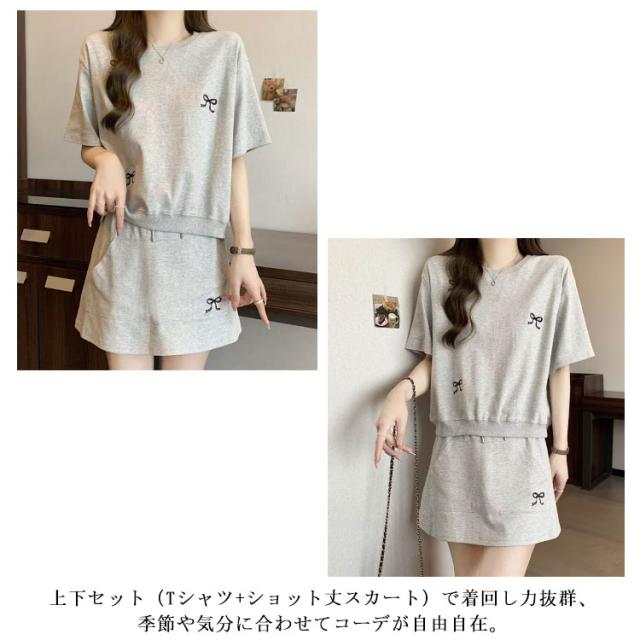 カットソー スカート 夏服 レディース ミニスカート スウェット 上下セット ショート丈 リボン柄 Tシャツ 無地 刺? 半袖 トップス セットアップ 韓国ファッション スポーツ カジュアル ゆったり 快適 ベージュ ネイビー グレー
