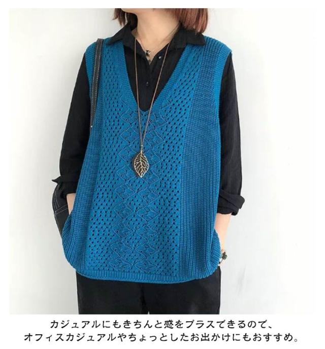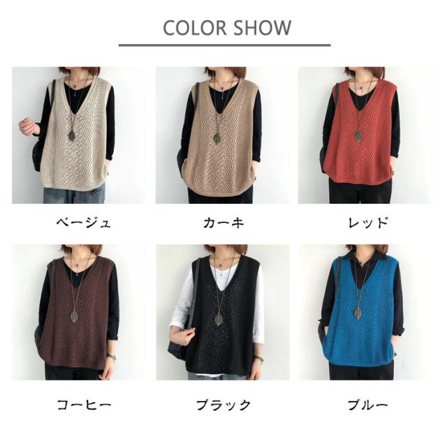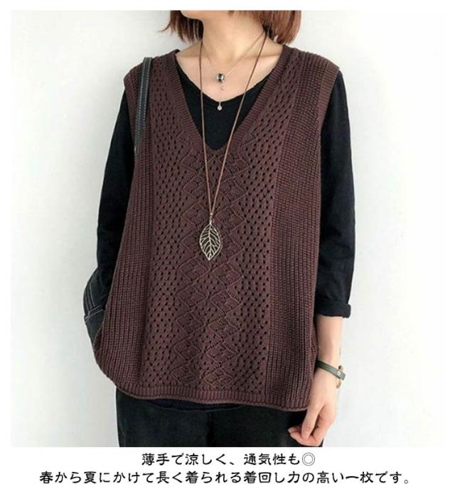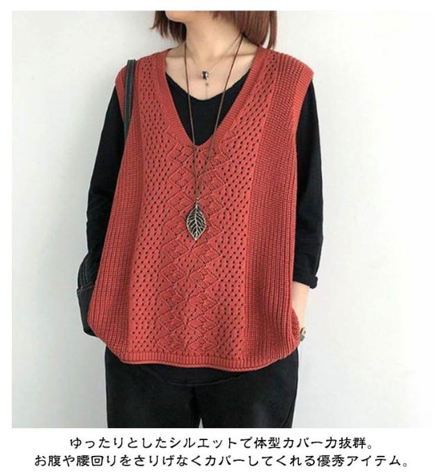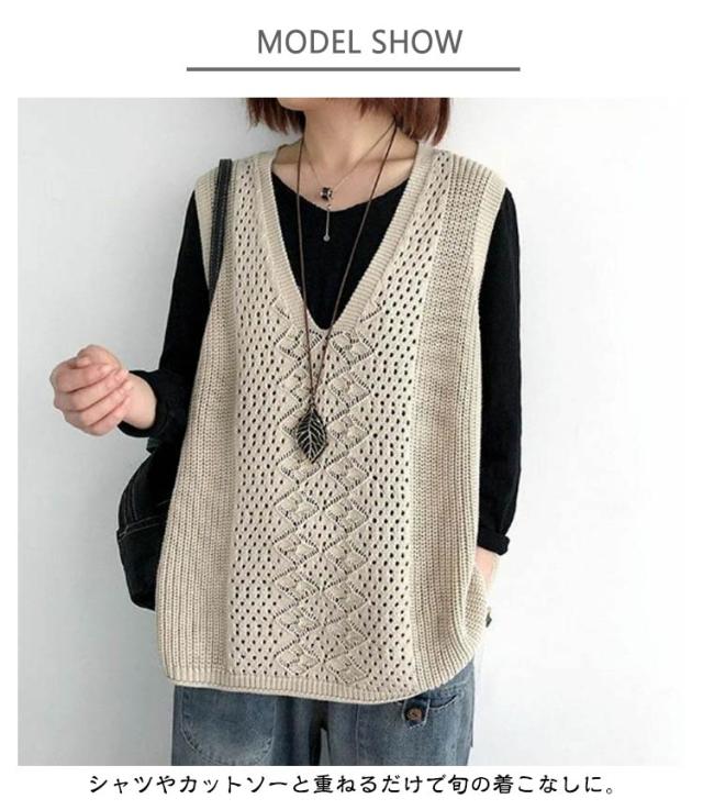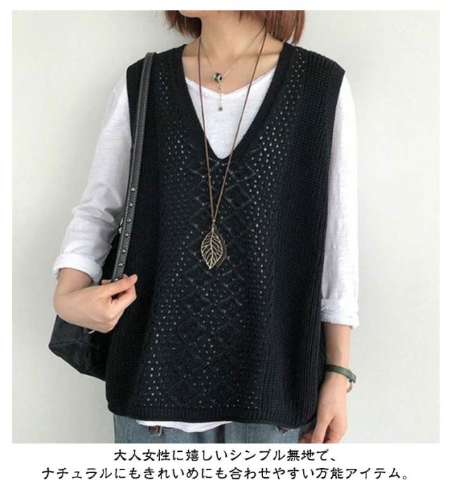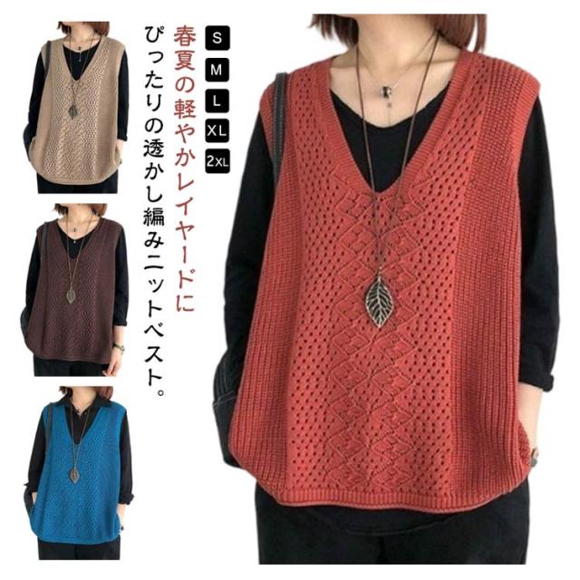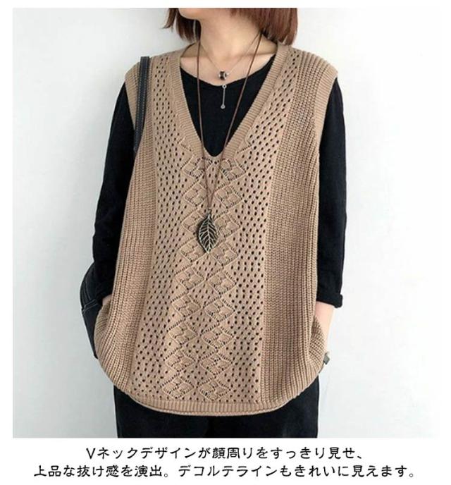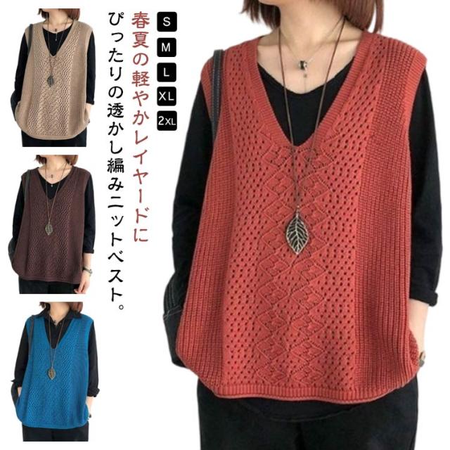 プルオーバー ニットベスト 薄手 大人 透かし編み レディース ノースリーブ 大きいサイズ Vネック 重ね着 春夏 サマーニット 体型カバー トップス 無地 ニットベスト ナチュラル きれいめ カジュアル おしゃれ 着痩せ レイヤード 30代 40代