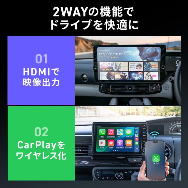 ●有線CarPlay対応のディスプレイオーディオに、HDMI入力端子とワイヤレスCarPlay機能を追加するアダプターです。●車にHDMI入力が無くても、TV Stickなどのストリーミングメディアプレイヤー、ゲーム機等の外部HDMIデバイスを簡単に接続することができます。