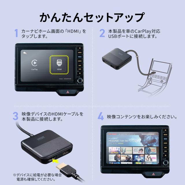 製品本体のUSB-A端子が充電口ではなくて、ファームウェア更新用です。外部のHDMIデバイスに別途電力供給する必要がございます。本アダプターを使用する際には、CarPlay機能が使えません。