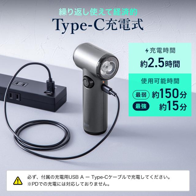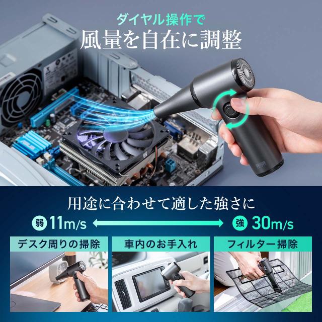 ●ガスを使用せず、繰り返し使える充電式の電動エアダスターです。●無段階で風量調整が可能なダイヤルスイッチを搭載しています。