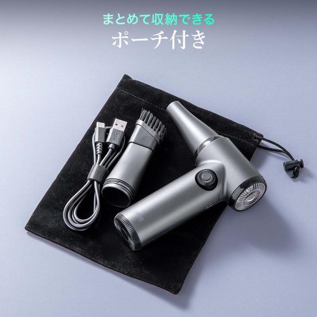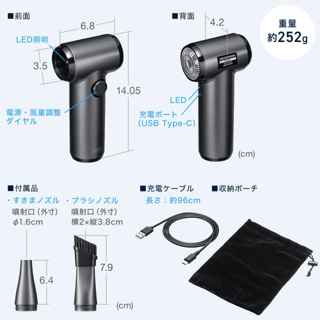 電動エアダスター 充電式 コンパクト 小型 軽量 風量無段階調節 ダイヤルスイッチ LEDライト ノズル2種類 収納ポーチ付属 ガス不使用 TypeC充電 逆さ噴射可能 クリーナー[200-CDADE003]