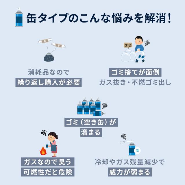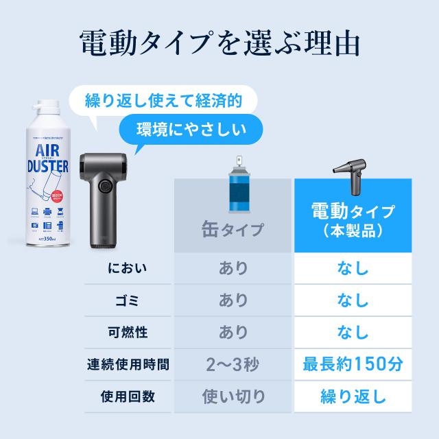 ●従来のエアダスターと異なり、ガスの匂いや空き缶の処理が不要で、火気による危険もありません。