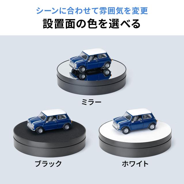 ●回転台の表面はミラー仕様で、黒と白の背景に変更可能。被写体に合わせた演出が可能です。