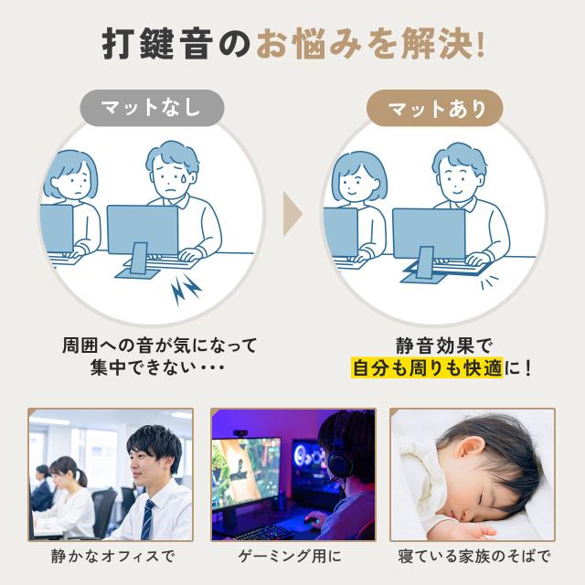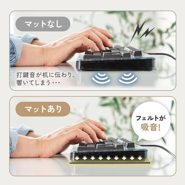●吸音性に優れた特殊なフェルト生地を使用したマットです。●机に打鍵音が直接伝わって響いてしまうのを、フェルトが吸音し、音が響きにくくします。