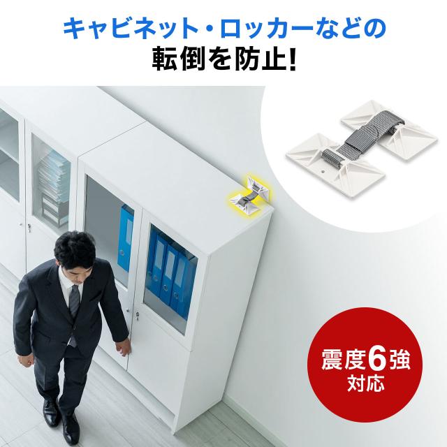 ⇒ご購入の前にご確認下さいキャビネット、ロッカー、オープン棚などのオフィス家具の転倒防止に最適。穴あけ不要、貼るだけで簡単に接着固定。ベルト長を調整できるので隙間があっても取り付け可能。ネジ穴が空いているのでネジ固定も可能。震度6強まで対応。【WEB限定商品】