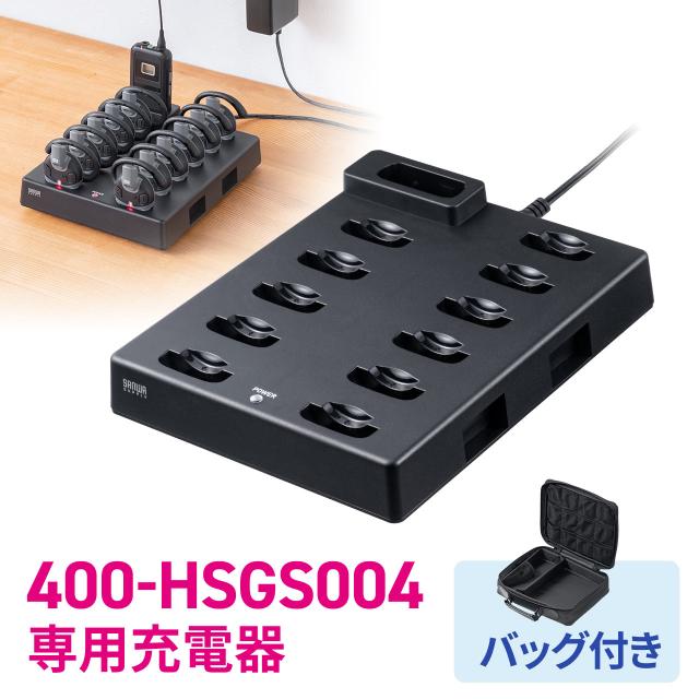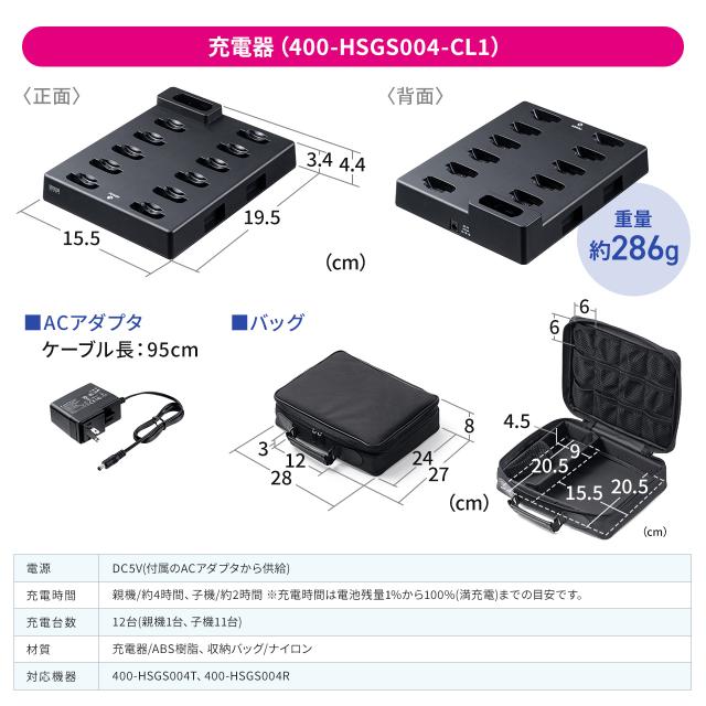 ●400-HSGS004シリーズの親機(400-HSGS004T)1台と子機(400-HSGS004R)11台をまとめて充電専用クレードルです。●400-HSGS004T/Rの下部にある接続端子を使用し、セットするだけで充電可能です