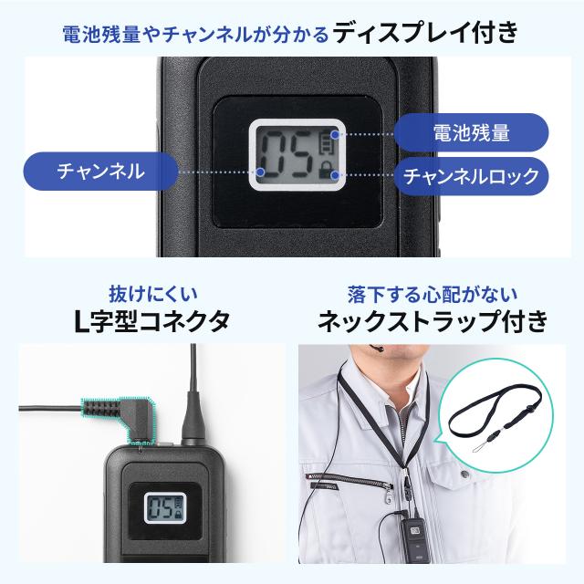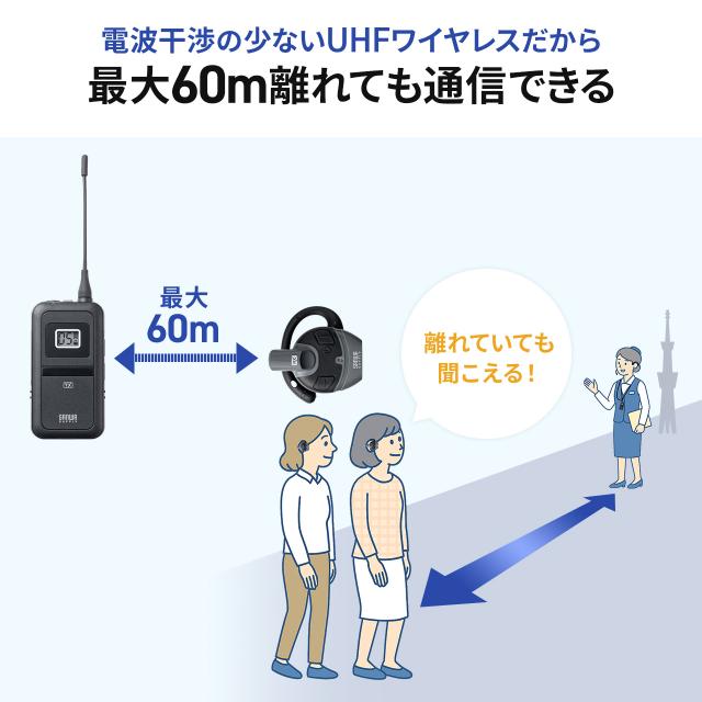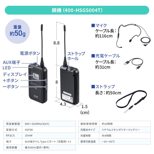 <400-HSGS004T/R共通特長>●ツアーガイドやガイダンス用など、音声をワイヤレスで多人数に一度に送信できるシステムマイクです。