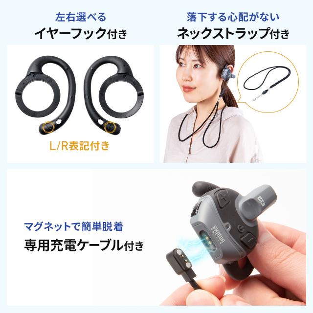 ■付属品:イヤーフックR×1(本体に装着済み)、イヤーフックL×1、子機用充電ケーブル(ケーブル長:約115?p)、ストラップ(長さ:約45.5cm)