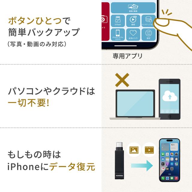 ⇒ご購入の前にご確認下さいType-CコネクタとUSB-Aコネクタのどちらも使えるバックアップUSBメモリ。iPhoneやiPadの写真・動画を専用アプリにて、ボタンひとつで簡単バックアップ&復元できる。Apple社 MFi認証(Made For iPhone/iPad)取得品。【WEB限定商品】
