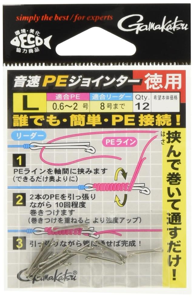 挟んで巻いて通すだけ!PEラインとリーダーを素早く簡単に接続できる超便利アイテム!複雑なノットに匹敵する結束強度最大90%以上を実現!!接続方法が簡単なので、強風時や暗い場所でもスム ーズに接続ができます。また、短い時合いの際にラインが切れても、すぐに結束ができるため、諦めずに釣りを再開することが出来ます。初心者の方はもちろんのこと上級者の方も必須アイテムになること間違いなし!0.1号~2号までのPEラインであれば釣種を問わず、様々な釣りに使用可能です。この音速PEジョインターを持っていれば快適な釣りが可能になります。