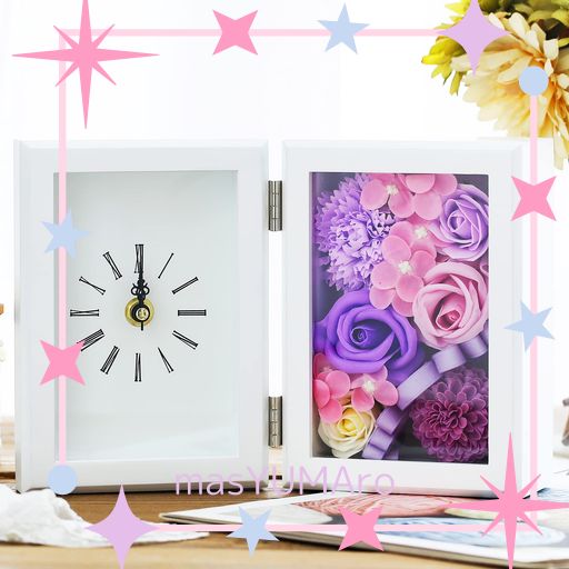 花時計・高級感のある素材:感謝の気持ちを綺麗なお花の時計と一緒にプレゼントしてみてはいかがでしょうか?「あなたと過ごした時間を忘れません」「これからのあなたに素晴らしい時間が刻まれますように」等の思いを伝えるのに最適!シャボンフラワーを使った花時計は、大切な記念や思い出にいつまでも枯れない綺麗なお花を添えることができます。部屋飾りと玄関飾りなどもできますし、通常のフレーム時計として使用することができますし、一石二鳥です。