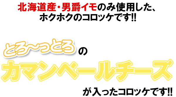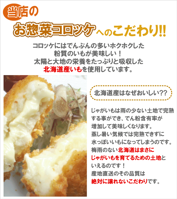 [関連ワード]北海道,じゃがいも,男爵,コロッケ,冷凍,冷凍食品,お惣菜,フライ,揚げ物,お中元,お歳暮,内祝い,カマンベールチーズ,チーズ