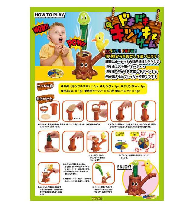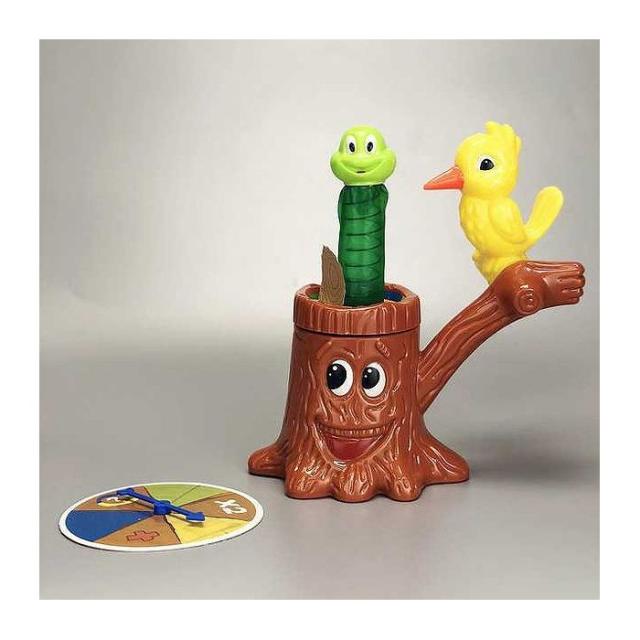 順番にルーレットの指示通りキツツキで切り株をつつきます。切り株に隠れているアオムシを飛び出せた人が勝ち!