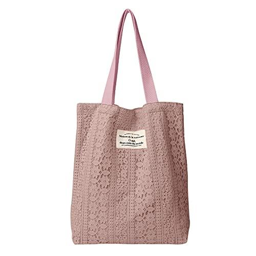 [Sueeya] (スイーヤ) トート バッグ レディース レース キャンバス ショルダー 2way 肩掛け 可愛い シンプル 軽量 おしゃれ シート 裏地付き 収納可能 ポケット ファッション 通勤 通学 (ピンク, Free Size)