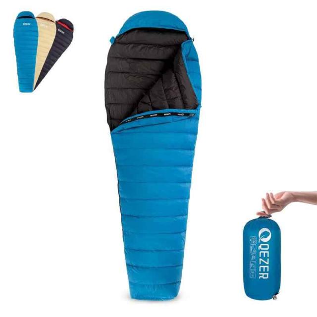 QEZER シュラフ ダウン 寝袋 コンパクト マミー型 900g/1200gダウン充填 冬用寝袋 600FP 260g/400g充填 春夏秋用 400T撥水加工 2人用に連結可能 アウトドア キャンプ 登山 車中泊 防災用 (260g-Blue, 羽毛量