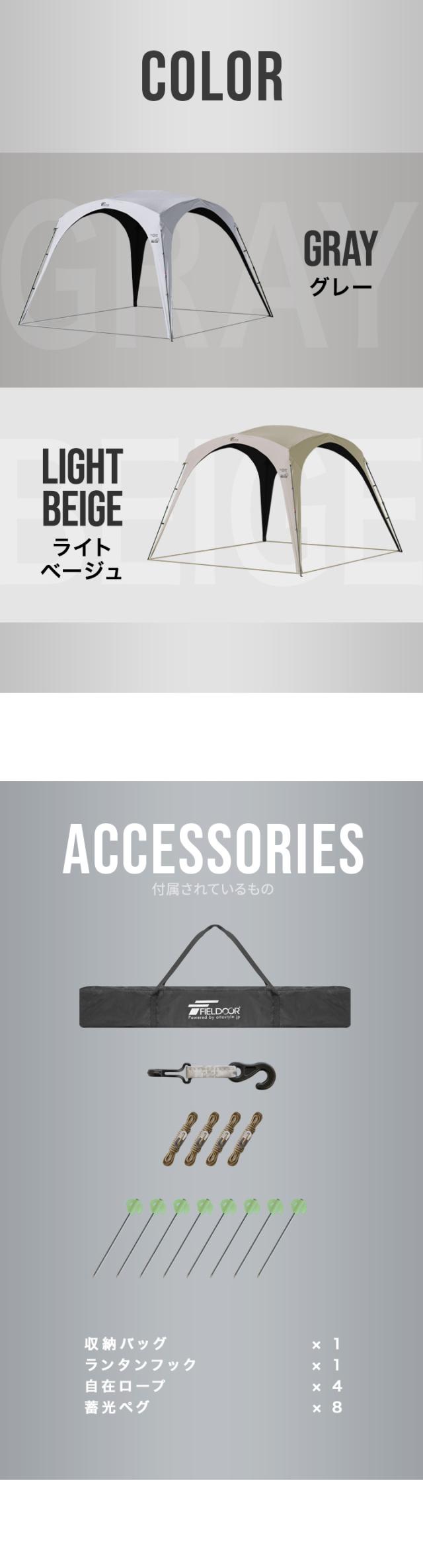 | 付属品: ・専用収納バッグ ×1 ・ランタンフック ×1 ・ロープ ×4 ・蓄光スチールペグ ×8 |
