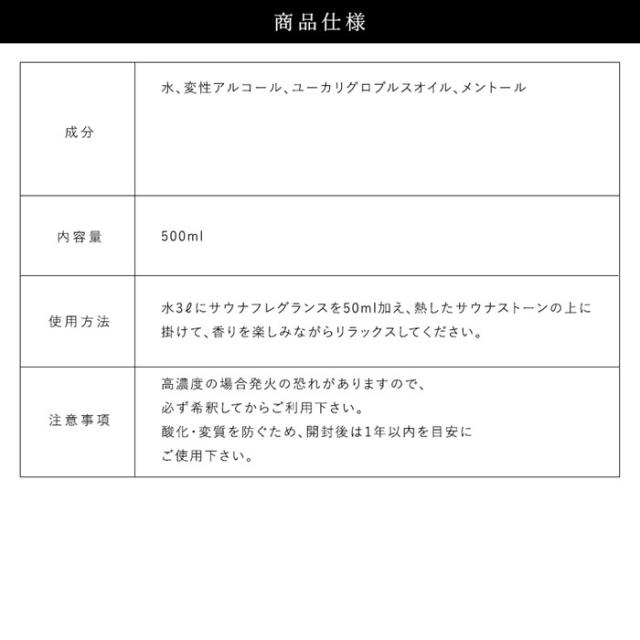 エメンド社のサウナフレグランスは、サウナに心地よい香りを加え、サウナをより楽しくしてくれます。 ユーカメントール グリーン系のすっきりとしたユーカリの香りに、メントールの清涼感をプラス。呼吸が深まり、心地よい開放感に包まれます。 エッセンシャルオイルを100%使用しています。合成香料は一切含まれていません。 ご使用方法 水3?にサウナフレグランスを50ml加え、熱したサウナストーンの上に掛けて、香りを楽しみながらリラックスしてください。 |