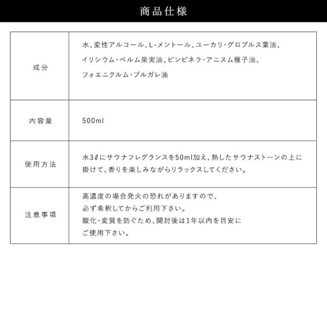 エメンド社のサウナフレグランスは、サウナに心地よい香りを加え、サウナをより楽しくしてくれます。 リコリスメントール ほんのり甘くスパイシーなリコリスの香りに、メントールの清涼感が重なったスイート&クールな香りです。すっきりとした心地よさが広がります。 エッセンシャルオイルを100%使用しています。合成香料は一切含まれていません。 ご使用方法 水3?にサウナフレグランスを50ml加え、熱したサウナストーンの上に掛けて、香りを楽しみながらリラックスしてください。 |