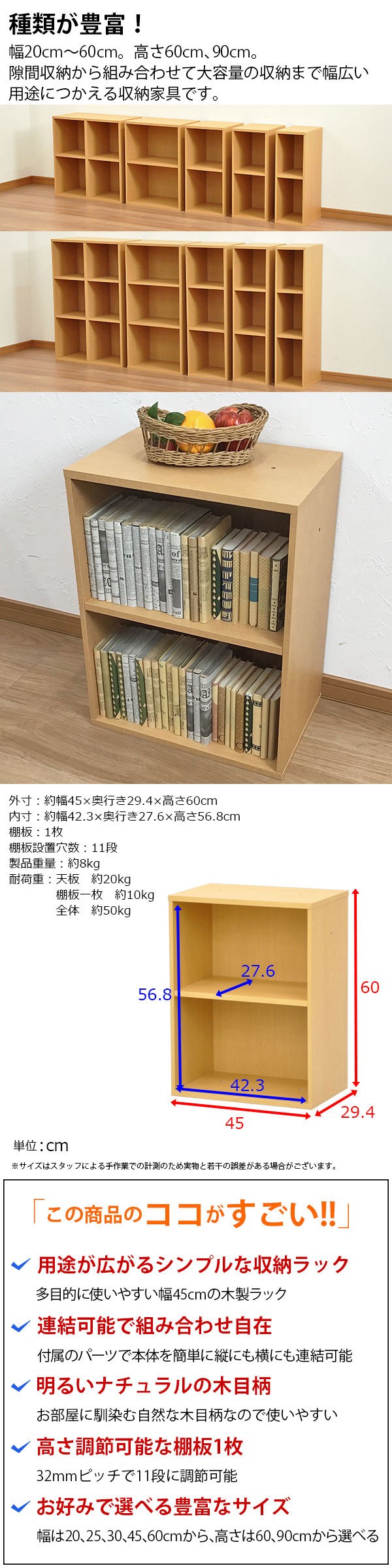 多目的に使いやすい幅45cmの木製ラック