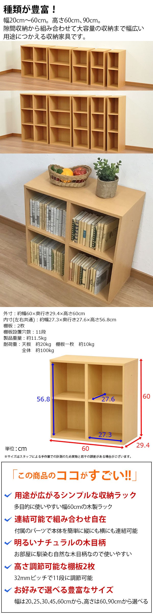 外寸:約幅60×奥行き29.4×高さ60cm(横連結時 幅120cm/縦連結時 高さ120cm)