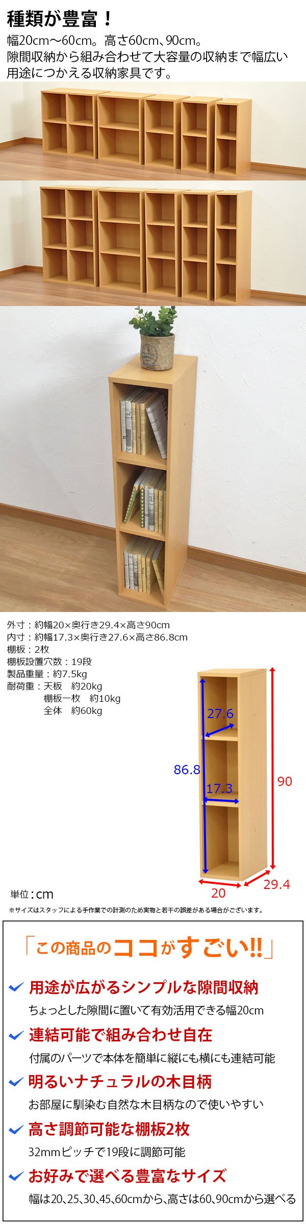すき間収納棚 2個セット 幅20cm (約)奥行30cm 高さ90cm (横連結時 幅40cm 縦連結時 高さ180cm) カラーボックス 3段 奥行29.4cm(約奥行30cm) 本棚 漫画収納 コミック収納 キッチン 洗面所 脱衣所 玄関 リビング すきま収納 隙間収納 多目的 ラック スリムラック 書棚 連結可能