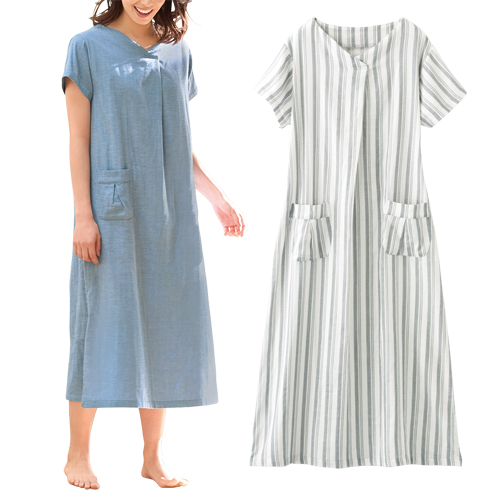 綿100%ダブルガーゼ ルームウェア 全2色 ワンピース Vネック コットン 半袖 レディース 婦人服 ミセス シニア 女性 ホームウェア 部屋着 ポケット付き ブルー グレーストライプ V首 シンプル 無地 体型カバー シニアファッション 40代 50代 60代 70代 80代 90代 母の日 お母さん おばあちゃん 春物 夏物 春夏