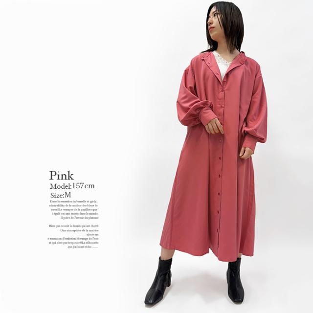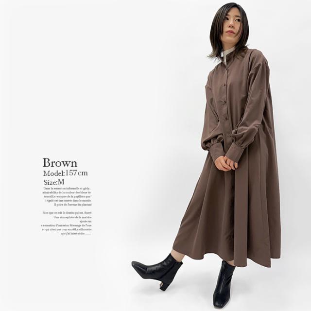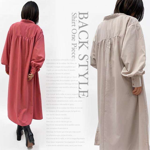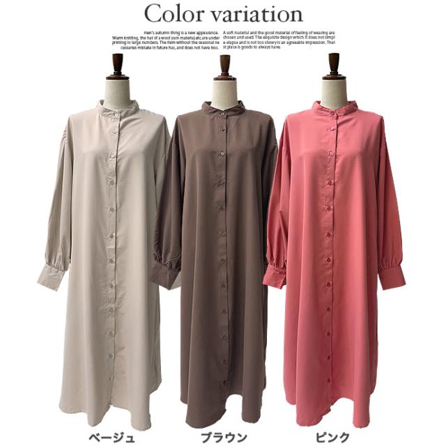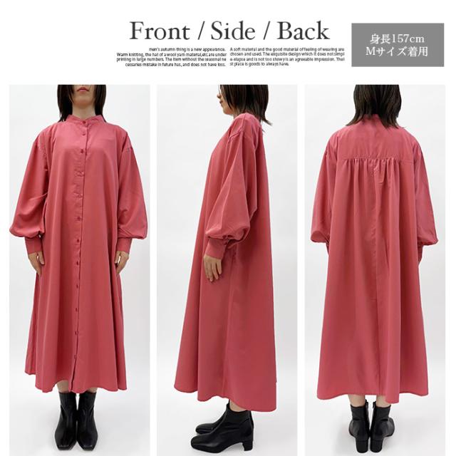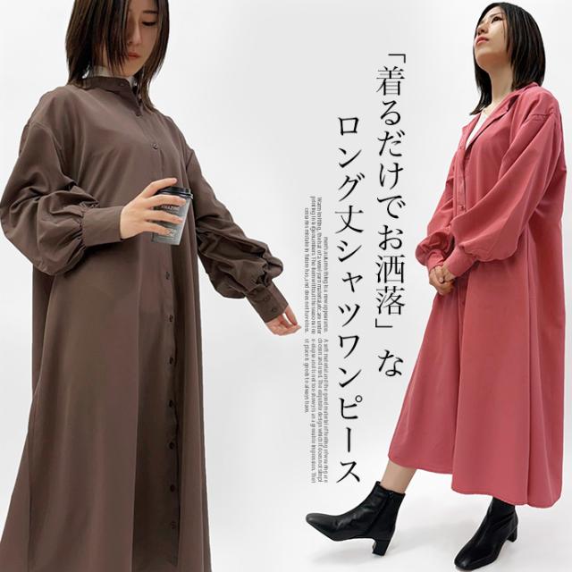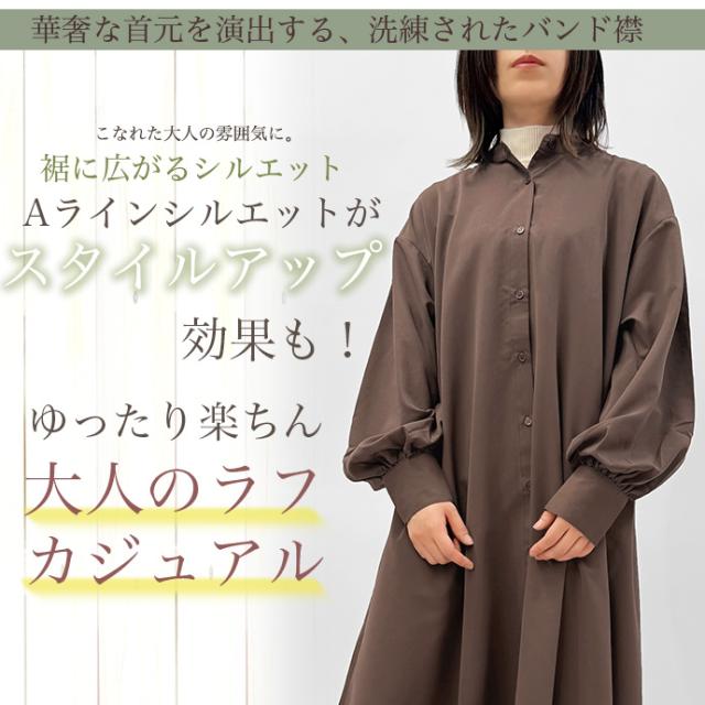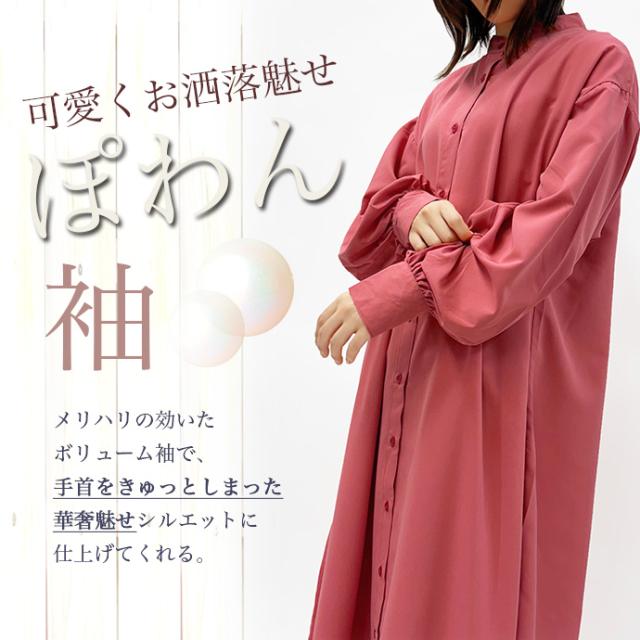ワンピース ロングワンピース シャツワンピース フレアワンピース 羽織り ロング丈 バルーン袖 バルーンスリーブ ぽわん袖 長袖 バンドカラー ゆったり Aライン 無地 シンプル レディース送料無料