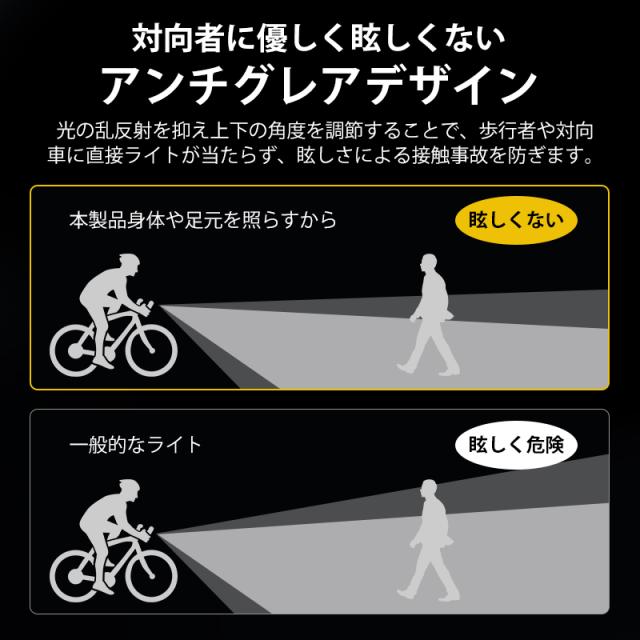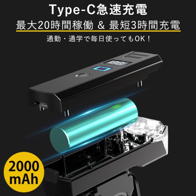 最大2000ルーメンの超明るさで、暗い道でも視界をクリアに確保。広角照射設計により、横からの車や歩行者にも早期に認知され、安全性が向上します。省エネ設計で連続点灯時間20時間以上を実現。