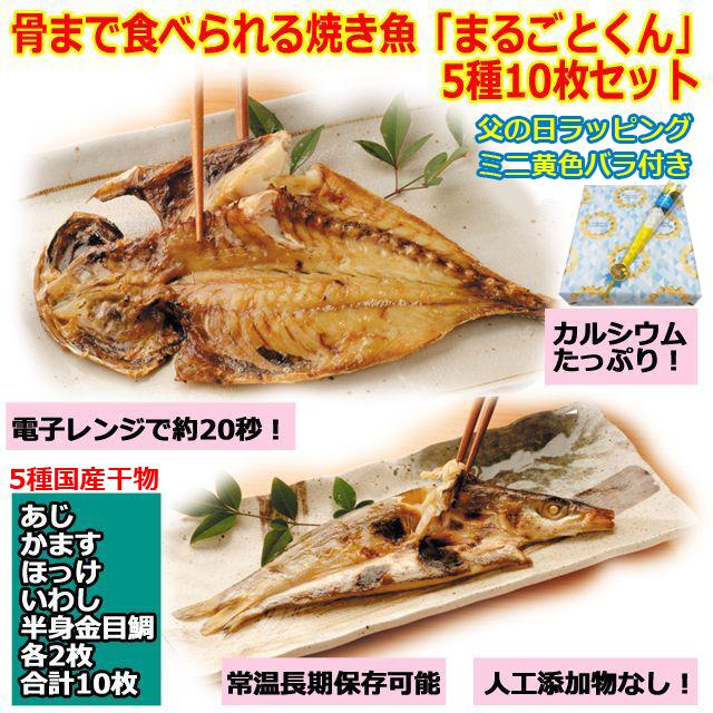 父の日ラッピング 骨まで食べれる焼き魚「まるごとくん」5種10枚セット ミニ黄色いバラ付き 国産 あじ かます ほっけ いわし 半身金目鯛 焼き魚 グルメ 食品