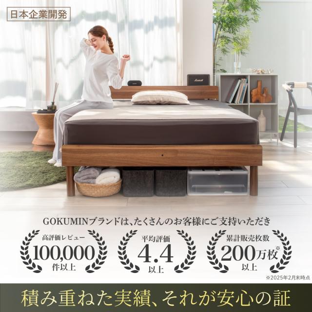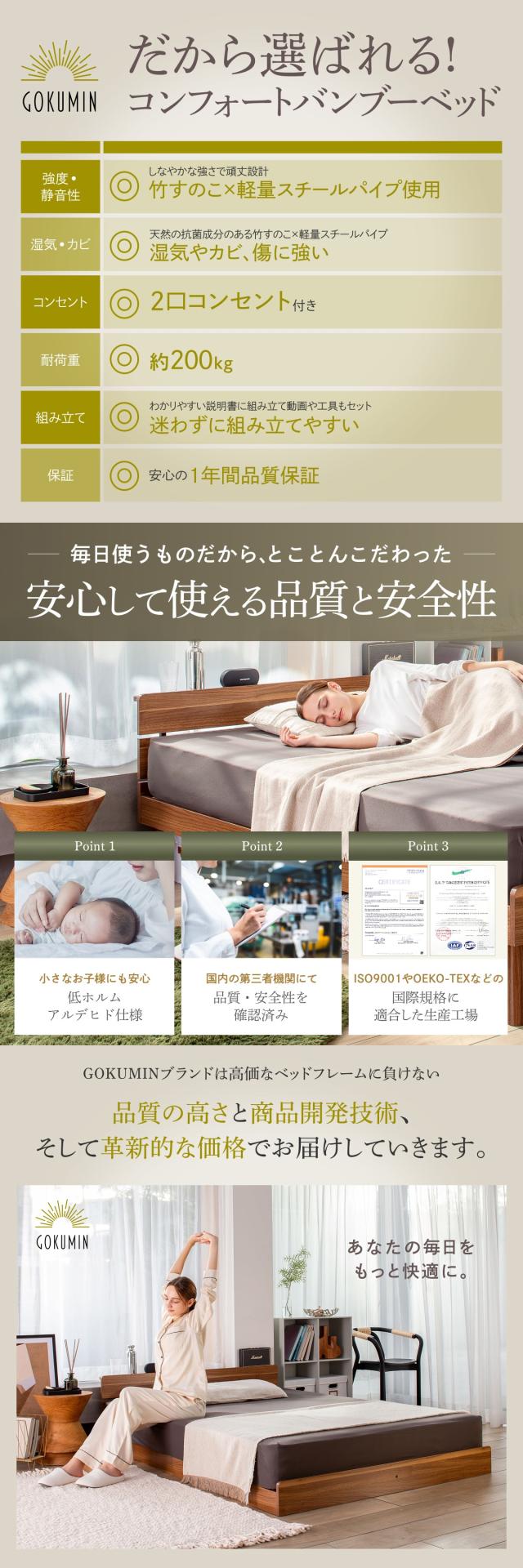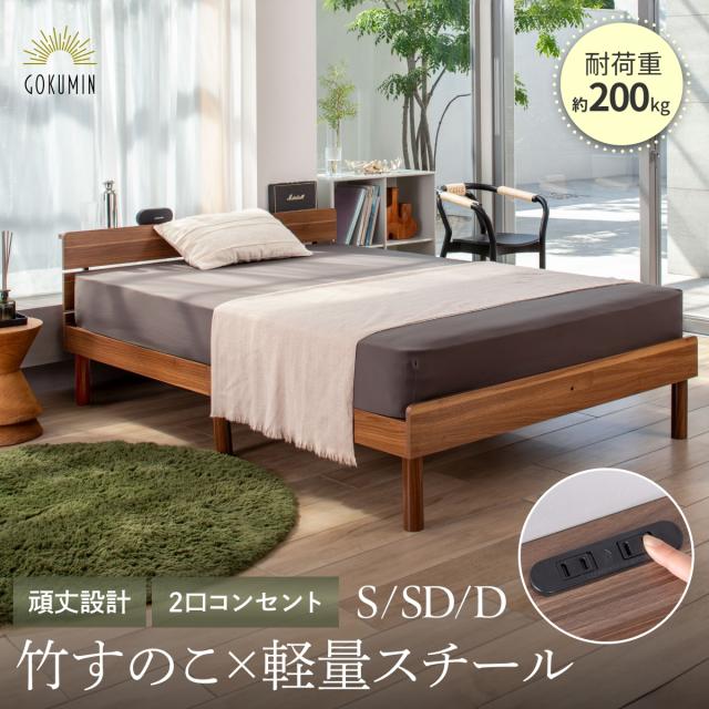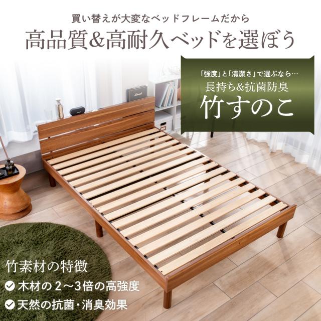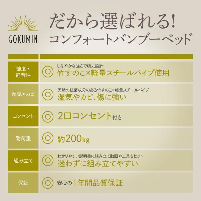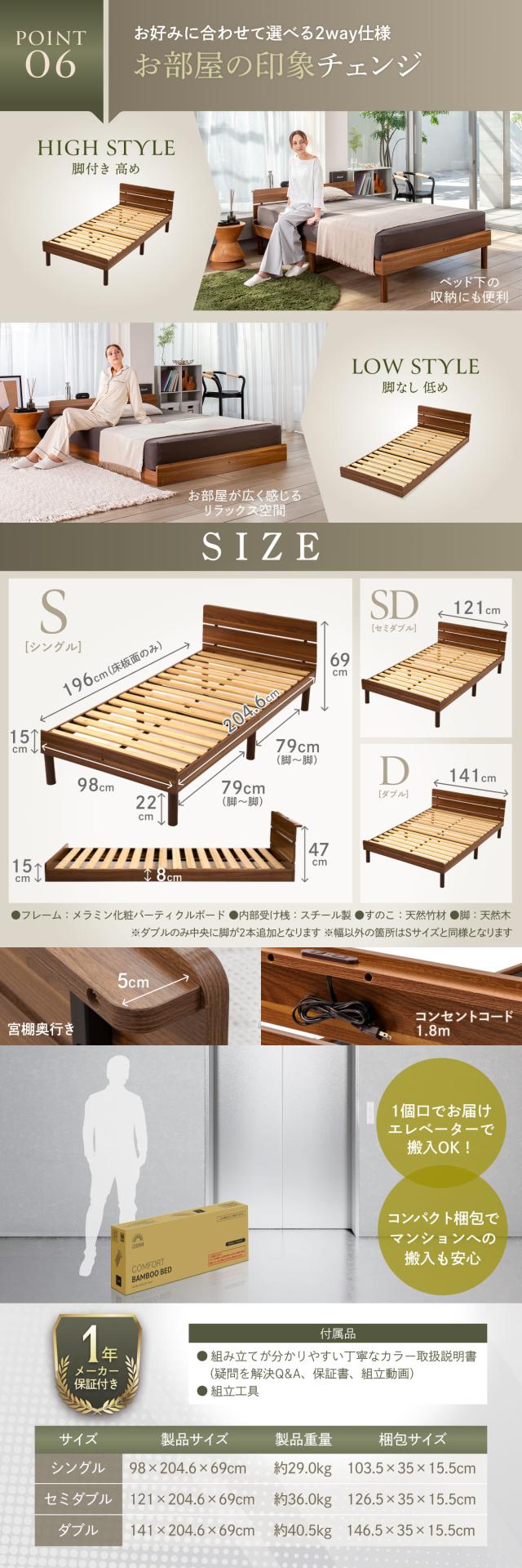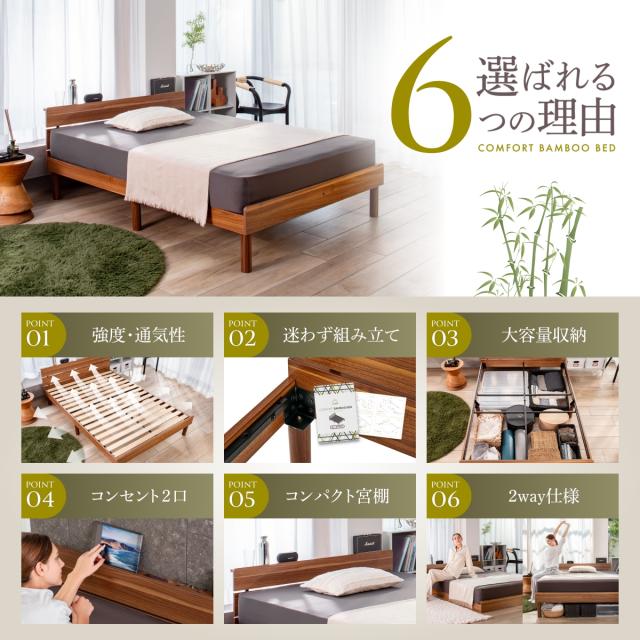 【収納力抜群!】 ベッドフレーム セミダブル すのこ GOKUMIN 日本企業 ヘッドボード/宮棚/コンセント付 ハイ/ロー選べる脚付き 竹素材使用で長持ち ベッド下収納でお部屋広々!フレームのみ コンフォートバンブーベッド