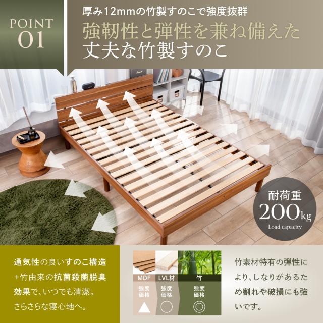想像を超えた強靭性と弾性!すのこに使用している竹材は一般的な木材の2〜3倍の強度を誇り、長年の使用にもびくともしない耐久性で長持ち。通気性抜群のすのこ構造 × 竹の天然抗菌作用が、湿気・カビ・ダニを寄せつけず、清潔&快適な寝室環境をキープ。「頑丈 × 快適 × 清潔」のすべてを兼ね備えた最強のすのこベッド、ここに誕生!