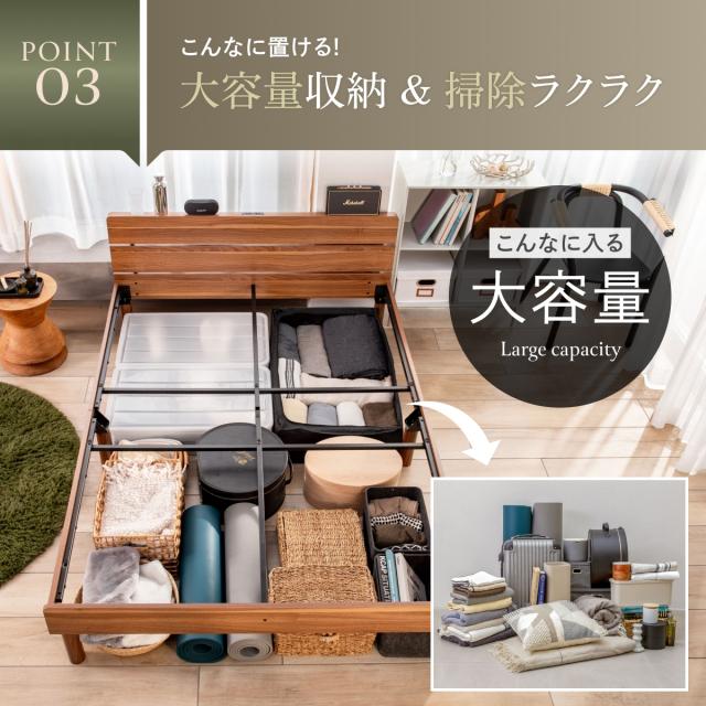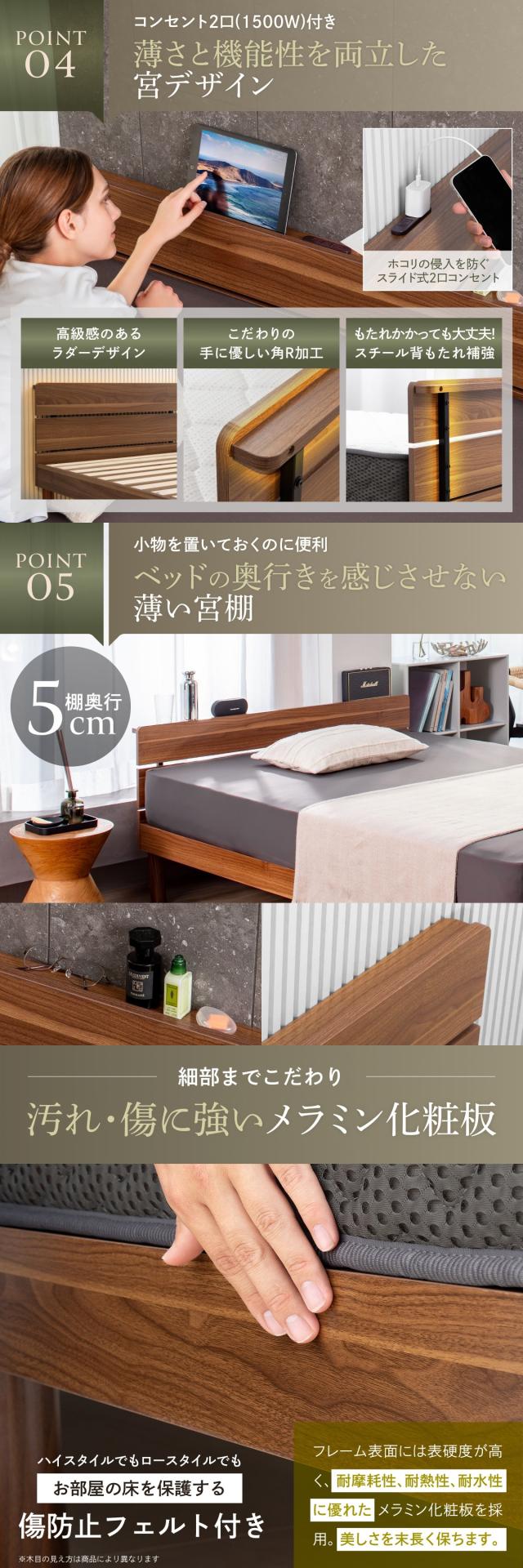 スマホもタブレットも枕元で即充電!2口コンセント付きの宮棚で、もう充電場所に悩まない。さらに、コンパクトながらしっかり収納できる設計で、ベッド周りはスッキリ快適空間に!快適さと便利さを極めた使い心地を是非ご体感ください。