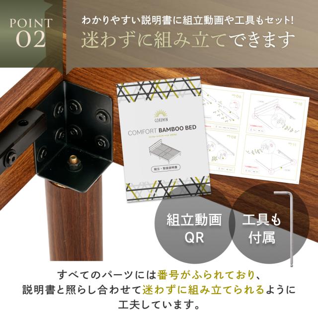 強靭性と弾性を兼ね備えた丈夫な竹素材を使用。木材の2−3倍の強度を持つ竹を使用し長くお使いいただけるベッドです。さらに、すのこの通気構造と竹の天然の抗菌作用が、清潔さと快適さを保ちます。