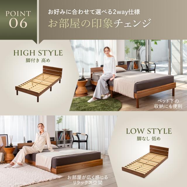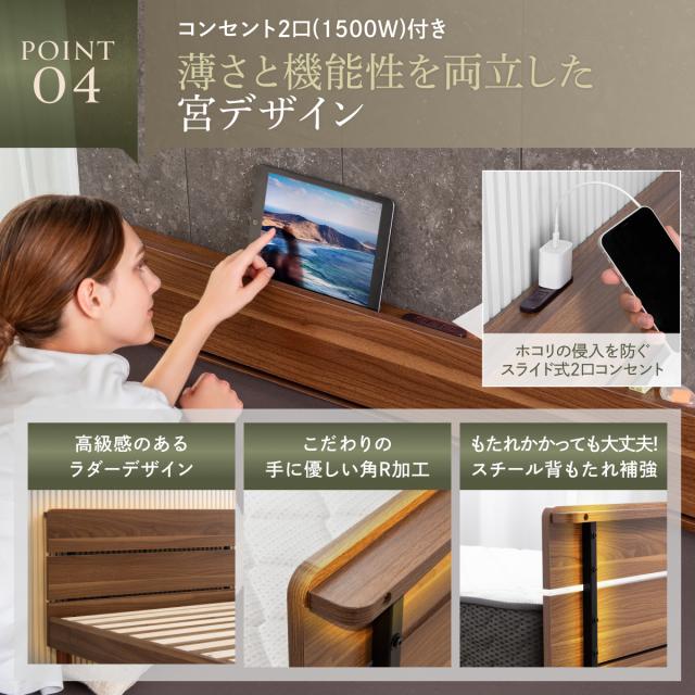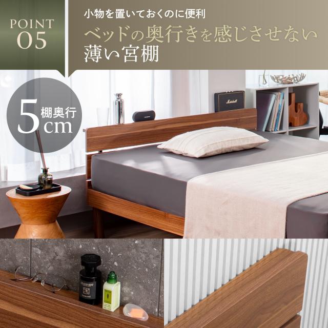 宮棚には2口コンセントが付いており、スマホやタブレットなどを枕元で充電できる便利な設計です。コンパクトな宮棚に物を置けるため、ベッド周りが快適に。