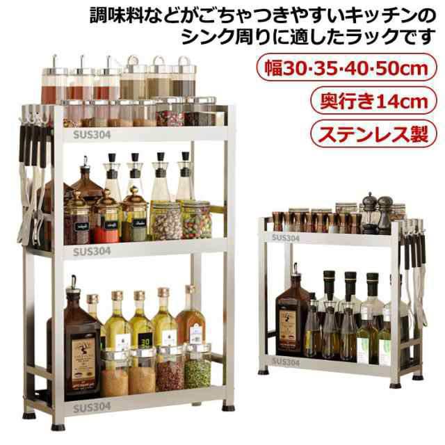 | 調味料などがごちゃつきやすいキッチンのシンク周りに適したラックです。【ステンレス製】【幅30?35?40?50cm】【奥行き14cm】 丈夫で錆びにくいステンレスで仕上げ 脚部用のすべり止めが付いているので、防滑で安定感があります。また、ゴム製の滑り止めが柔らかくて貴重な家具を傷つけません。 スリムで2段式のスパイスラックなので、少しスペースがあれば、大量収納できます。 調理道具などをかけられるフック4個付き デットスペースを活用できるシェルフ。コンロ脇のスペースにもぴったり。 調味料、スパイス類、キッチン道具、小物を一括収納できます。 | |