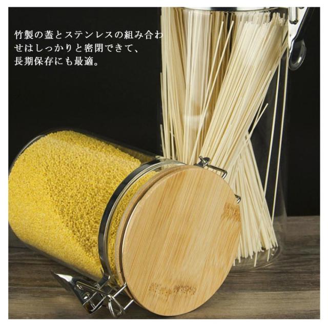 | 中身が見やすいガラス密封瓶。【お得な2個セット】【防塵防湿 長期保存】 広口のデザインで使いやすい。 竹製の蓋とステンレスの組み合わせはしっかりと密閉できて、長期保存にも最適。 中に入れる食材によって、キッチンインテリアとして飾ってオシャレに演出しながら、使いたい時にはサッと使えます。 | |