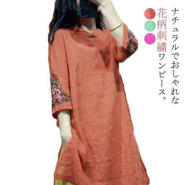 チャイナドレス エスニック ワンピース 刺繍 チュニックワンピース 七分袖 チャイナ服 花柄ワンピース 民族風 綿 ゆったり カジュアル 大きサイズ 春夏 夏 ワンピ