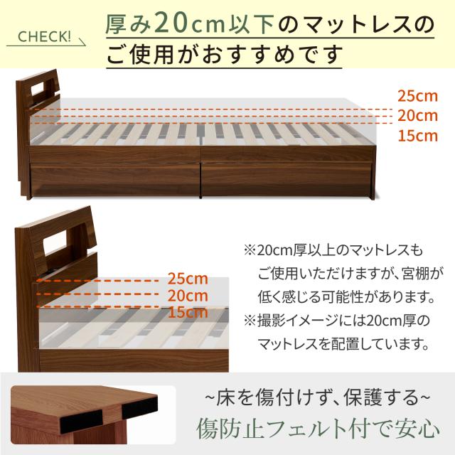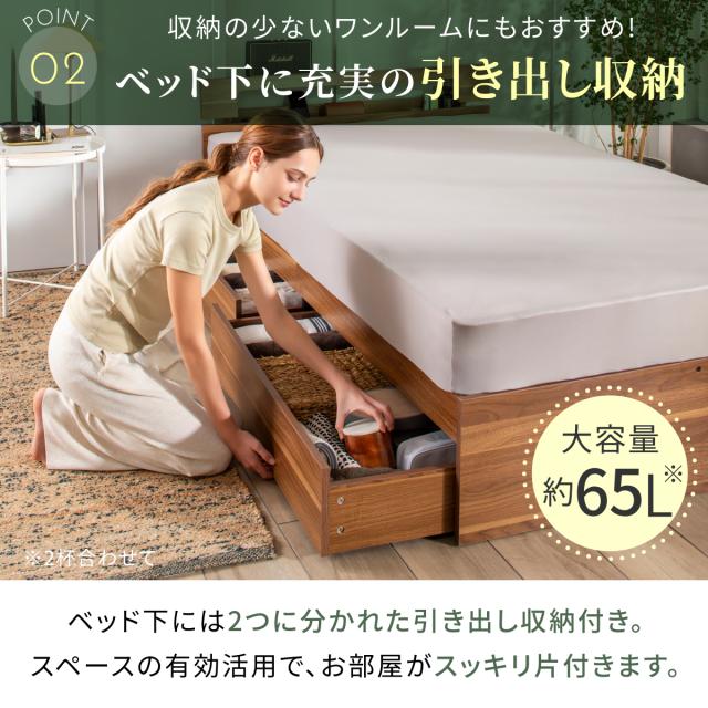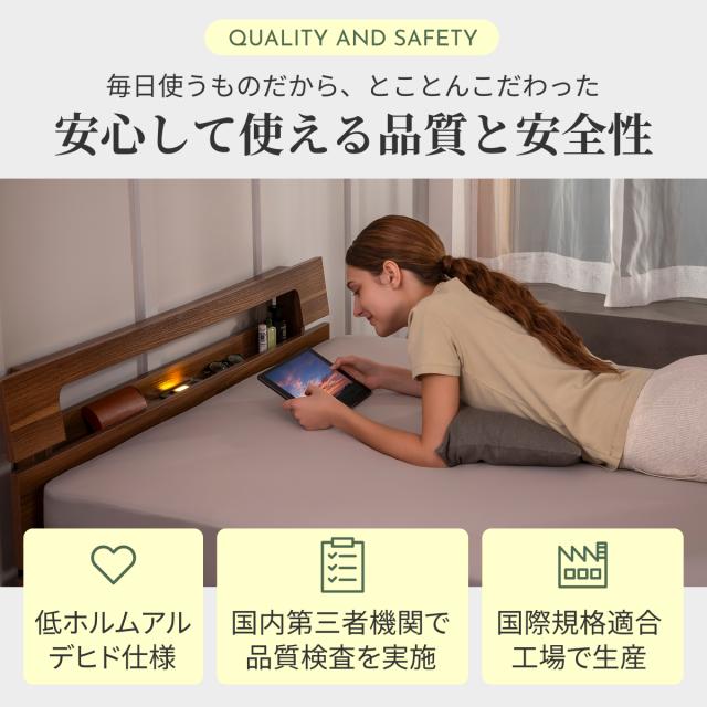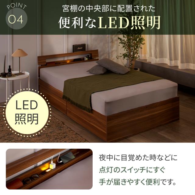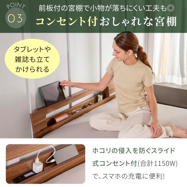 宮棚にはスマホやタブレットを枕元で充電できるコンセント付きでもう充電場所に悩まない。さらに、LED照明付きで、まるで高級ホテルのような落ち着いた空間を演出。