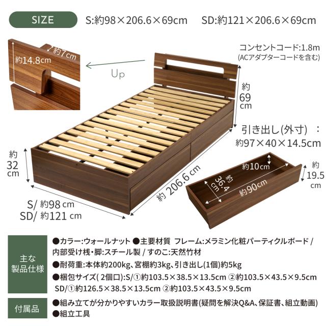 [商品詳細] ●シングルサイズ :約98×206.6×69cm ●セミダブルサイズ :約121×206.6×69cm ●材質:合成樹脂化粧繊維板(メラミン)、スチール(エポキシ樹脂粉体塗装) 、竹●カラー :ウォールナット ●製品重量 : 約50kg(シングル)、約60kg(ダブル) ●シングル梱包サイズ : (2-1)約103.5×38.5×13.5cm(2-2)約103.5×43.5×9.5cm ●セミダブル梱包サイズ(2-1)約126.5×38.5×13.5cm (2-2)約103.5×43.5×9.5cm(セミダブル) ●工具付き ●日本語取扱説明書 ●安心の1年間保証書 ●日本企業開発中国専用工場生産
