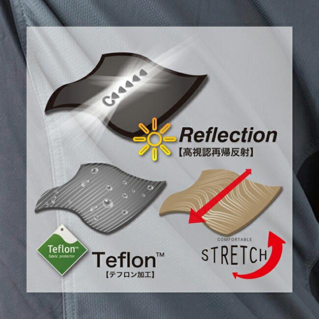 特徴:ストレッチ、軽量、防汚、撥水、高視認(反射プリント)、速乾、ハニカム構造、ユニセックス