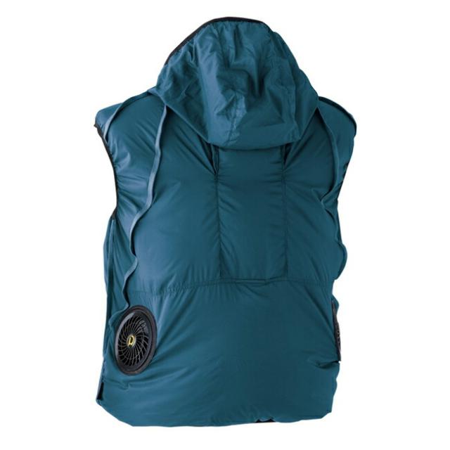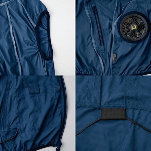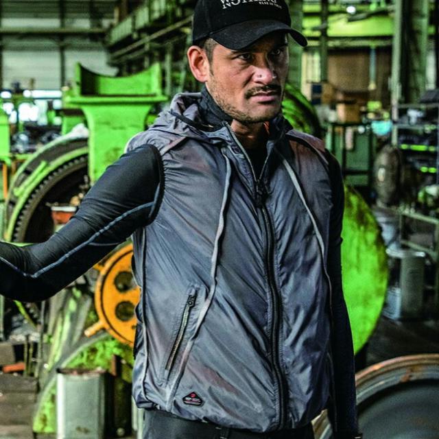 衿裏まで風が流れる背中ダクト、外ポケットにバッテリーを入れて使えるケーブル通し穴、バッテリー専用内ポケットを装備し、反射ロゴプリントなどもアクセントに。