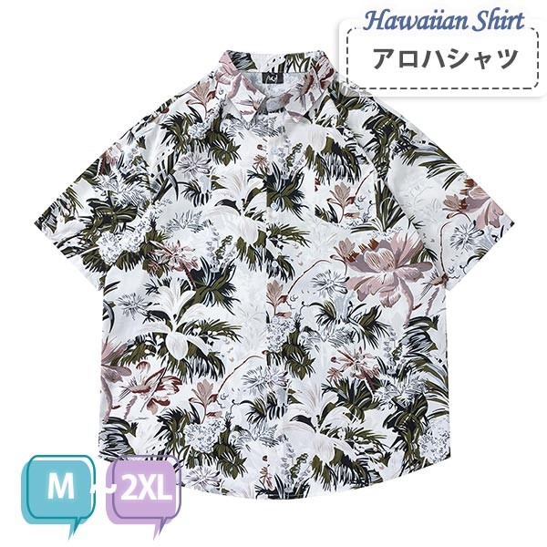 アロハシャツ シャツ ボタニカル柄 葉っぱ柄 リーフ柄 総柄 ヴィンテージ風 メンズ レディース ペアルック 男女兼用 開襟シャツ 夏物 沖縄旅行 ハワイアン 半袖 シンプルデザイン 開襟 オープンカラー カジュアル ストリートリゾート M L XL 2XL ホワイト