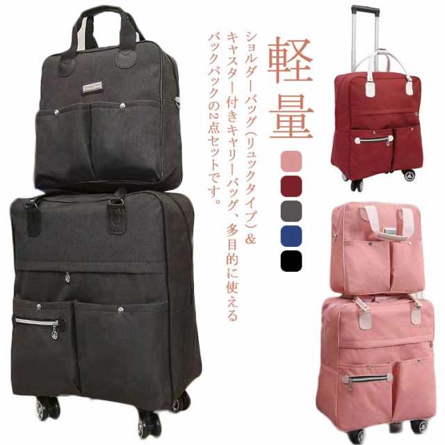 | ショルダーバッグ(リュックタイプ)&キャスター付きキャリーバッグ、多目的に使えるバックパックの2点セットです。 耐久性に優れたオックスフォード、水を弾く撥水加工。 機内持ち込み可! 旅行、ビジネス、出張、登山、通勤通学等に最適。 旅行や遠出、釣りや登山などの趣味にも大活躍、収納ポケットが多数装備。 チケットや手帳など小物を入れ、カード、小物収納ポケットも充実しています。 プレゼントにもピッタリです。 | |