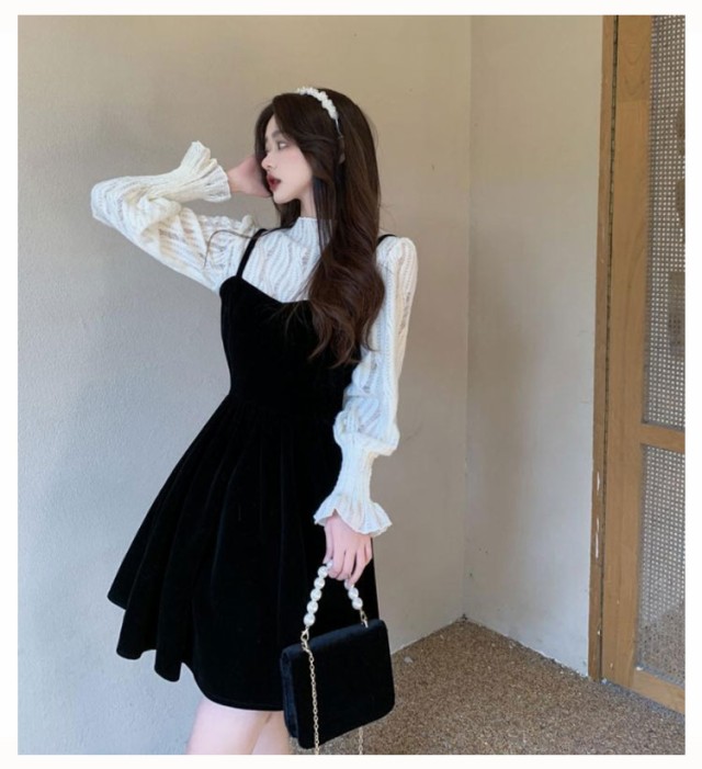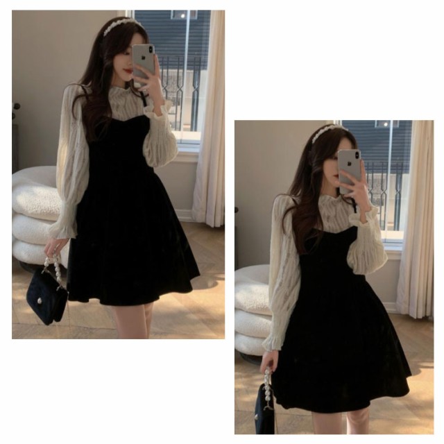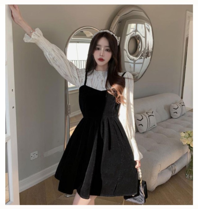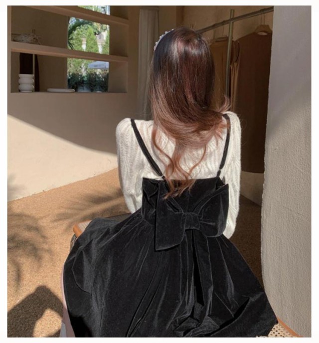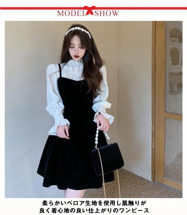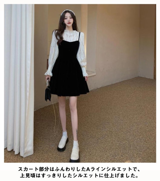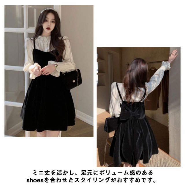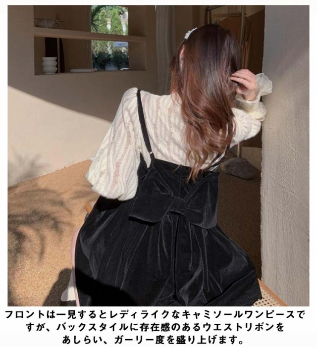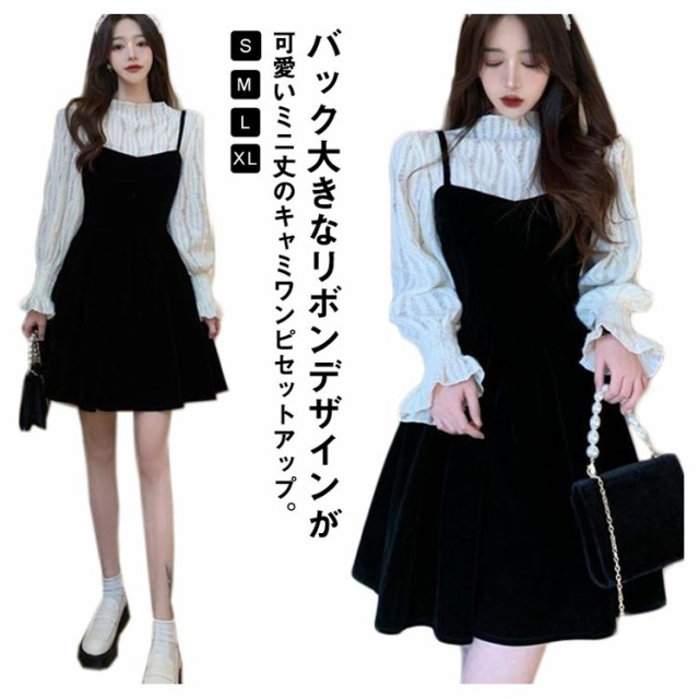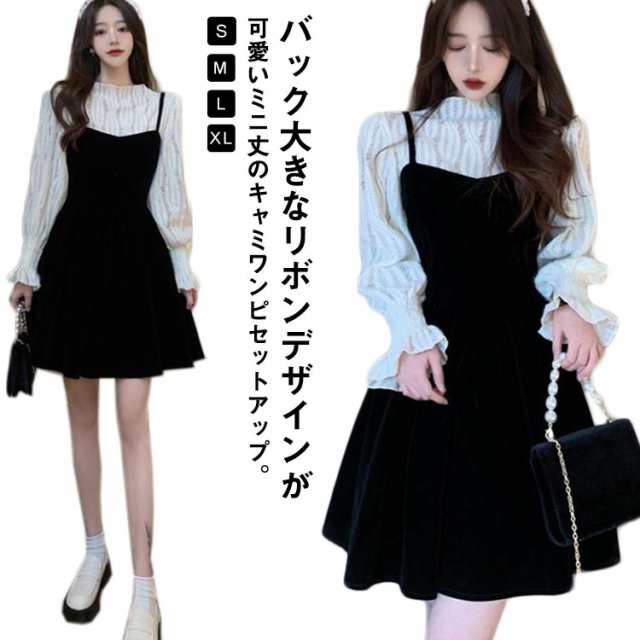 ワンピース セットアップ キャミソール ワンピース ミニ丈 レディース 大きい リボン フレア Aライン ワンピ ベロア ブラウス 長袖 メロウ 大人可愛い ミニワンピース 着痩せ 春秋 通勤 普段着 パーティー お呼ばれ オシャレ
