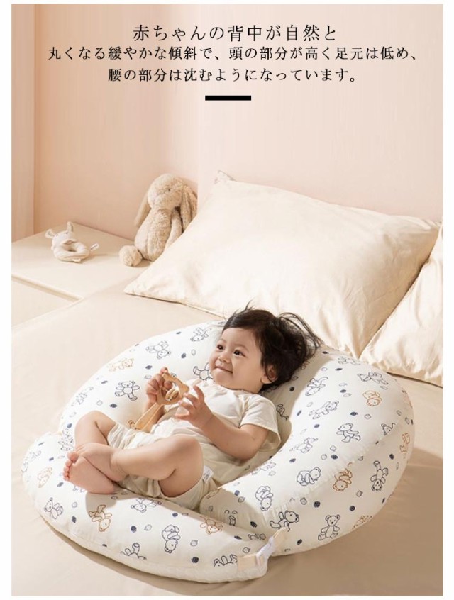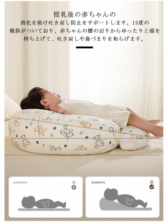 | 赤ちゃんの背中が自然と丸くなる緩やかな傾斜で、頭の部分が高く足元は低め、腰の部分は沈むようになっています。 授乳後の赤ちゃんの消化を助け吐き戻し防止をサポートします。 15度の傾斜がついており、赤ちゃんの腰の辺りからゆったりと頭を持ち上げて、吐き戻しや鼻づまりを和らげます。 寝ている赤ちゃんを置くと起きてしまう背中スイッチの対策にもなります。 通気性・吸汗性に優れたコットン素材のカバーを使用しており、取り外して洗えるためいつでも清潔に使えます。 吐き戻し防止ベビークッションとして以外にも、授乳クッションや抱っこ時のサポートクッション、お昼寝クッションなどいろいろなシーンで活躍! 新生児?幼児まで長く愛用できます。 | |