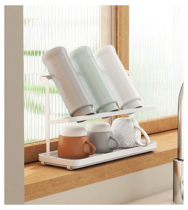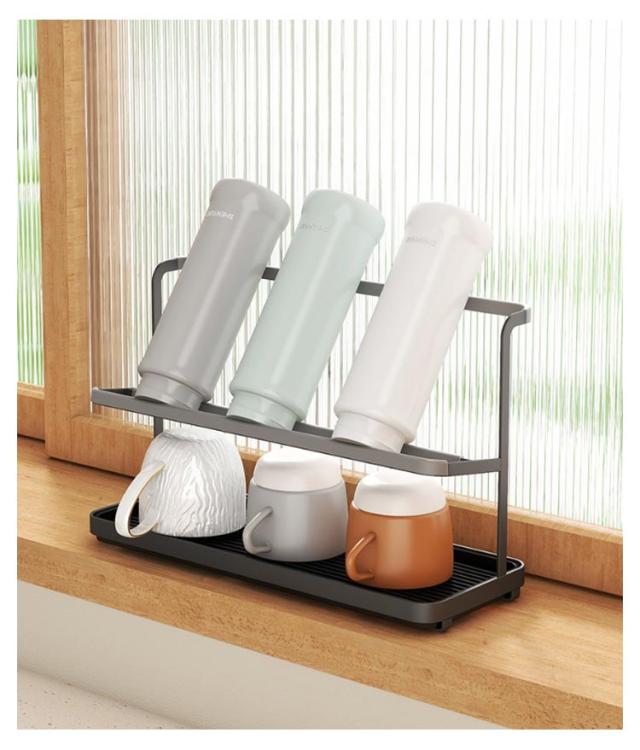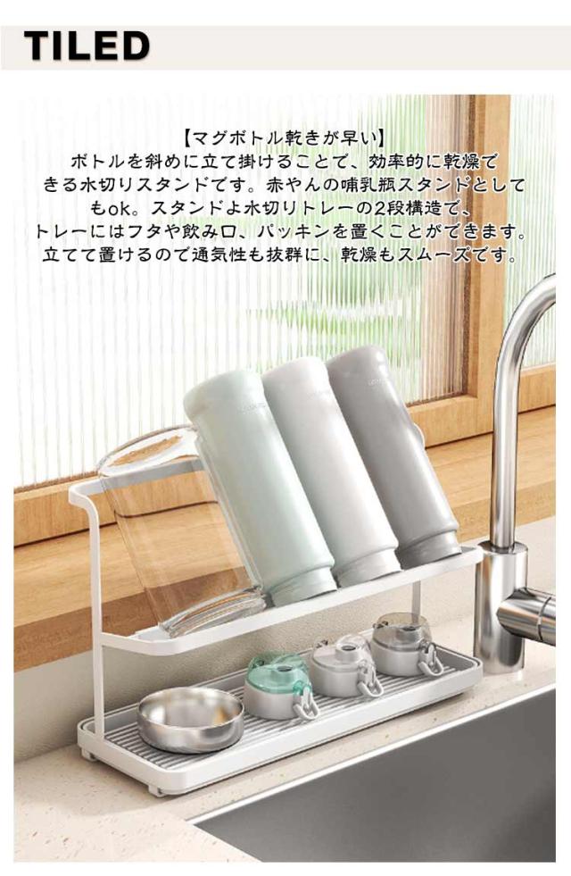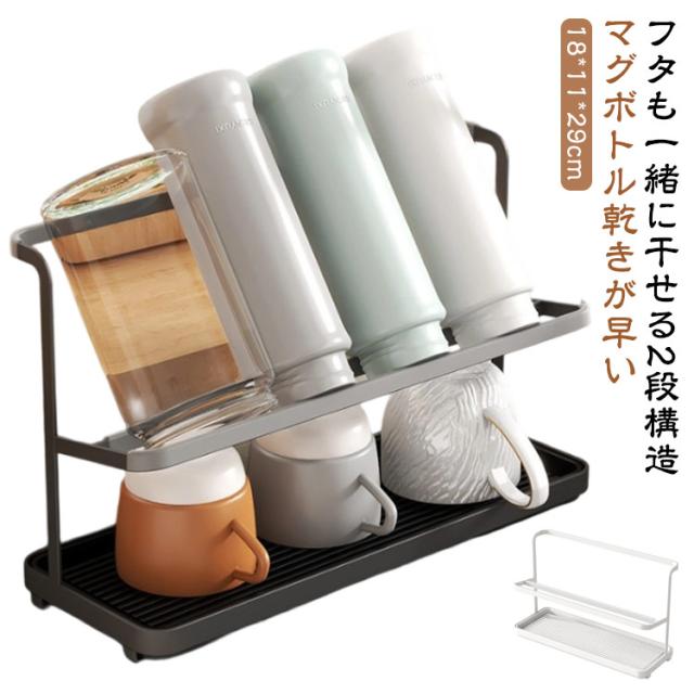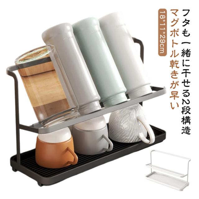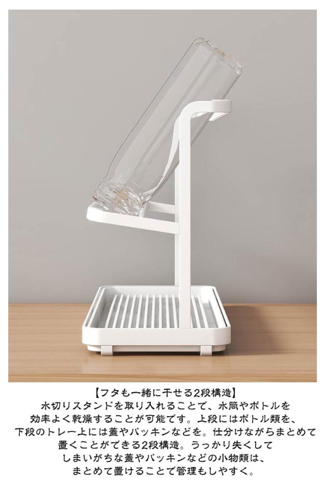 | 【マグボトル乾きが早い】ボトルを斜めに立て掛けることで、効率的に乾燥できる水切りスタンドです。赤やんの哺乳瓶スタンドとしてもok。スタンドよ水切りトレーの2段構造で、トレーにはフタや飲み口、パッキンを置くことができます。立てて置けるので通気性も抜群に、乾燥もスムーズです。 【フタも一緒に干せる2段構造】水切りスタンドを取り入れることで、水筒やボトルを効率よく乾燥することが可能です。上段にはボトル類を、下段のトレー上には蓋やパッキンなどを。仕分けながらまとめて置くことができる2段構造。うっかり失くしてしまいがちな蓋やパッキンなどの小物類は、まとめて置けることで管理もしやすく。 【洗いやすくて清潔に保てる】本体、トレーごとに分解できるので、すみずみまで洗えます。洗ったものを収納するからこそ、清潔に保てるのも嬉しいポイントです。キッチンに新しい外観を与え、毎日使用する水筒やカップを清潔で乾燥した状態に保つ、定期的なお手入れでカビや水垢を防ぐことができます。 | |