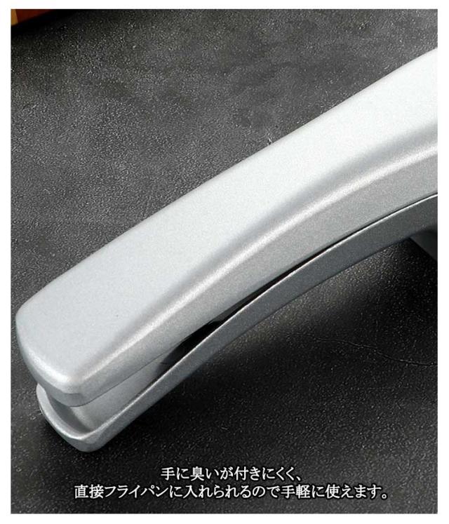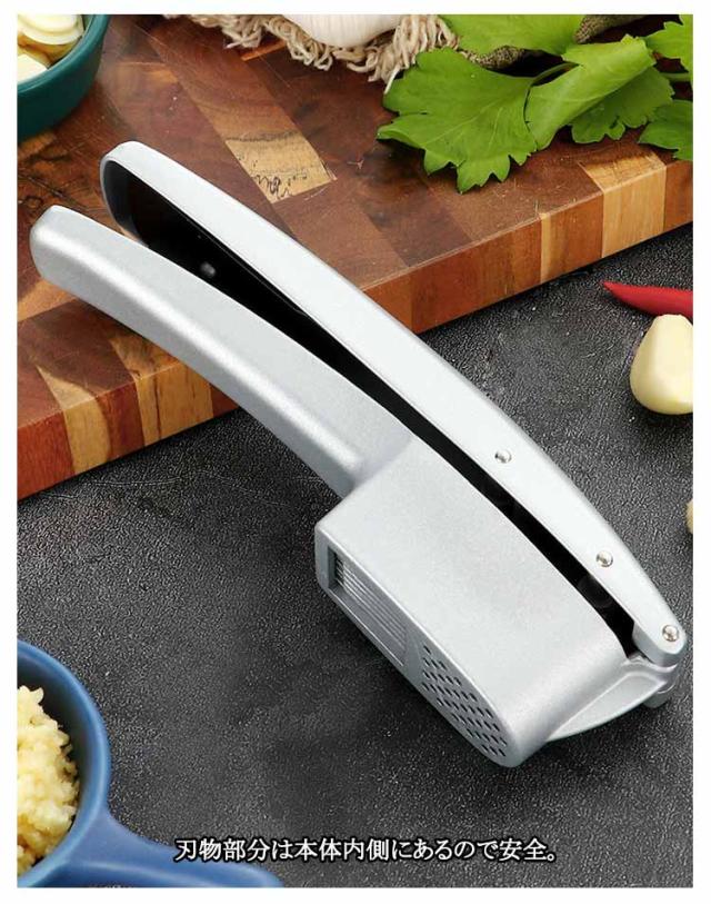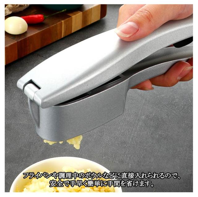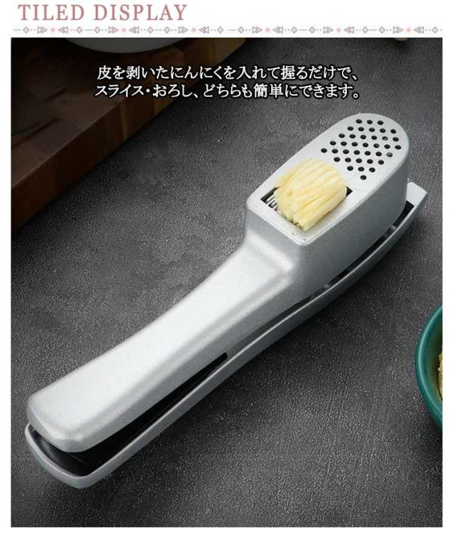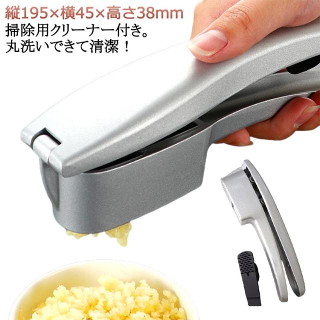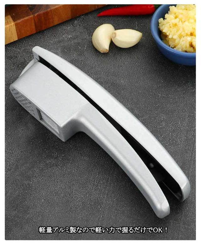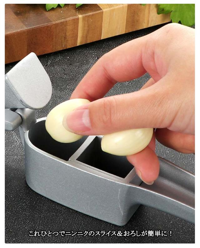 | 掃除用クリーナー付き。丸洗いできて清潔! 皮を剥いたにんにくを入れて握るだけで、スライス・おろし、どちらも簡単にできます。 これひとつでニンニクのスライス&おろしが簡単に! 軽量アルミ製なので軽い力で握るだけでOK! 手に臭いが付きにくく、直接フライパンに入れられるので手軽に使えます フライパンや調理中のボウルなどに直接入れられるので、安全で手早く簡単に手間を省けます。 刃物部分は本体内側にあるので安全。 | |